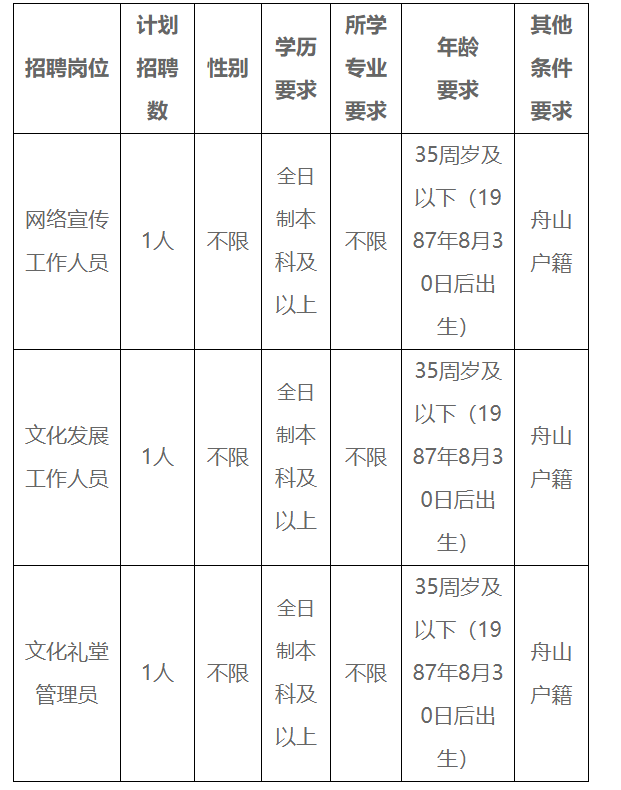 報(bào)名方式:應(yīng)聘者可到普陀區(qū)委宣傳部1005辦公室(普陀區(qū)東港街道普陀商務(wù)中心1號(hào)樓10樓)報(bào)名,聯(lián)系人:林先生,聯(lián)系方式:3012122,13575626218;也可網(wǎng)上報(bào)名,發(fā)送相關(guān)材料到郵箱:447944991@qq.com。逾期不再補(bǔ)報(bào)。