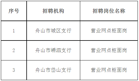 (二)具有兩年以上工作經(jīng)驗(yàn),具備招聘崗位要求的專業(yè)能力與綜合素質(zhì),具有金融同業(yè)工作經(jīng)驗(yàn)者優(yōu)先。應(yīng)聘舟山地區(qū)及臺(tái)州分行下轄支行崗位,工作年限可放寬至一年。