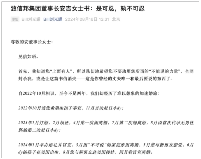 劉光耀提到:“從卸任CEO到不做網(wǎng)紅,您再也別拿公司和事業(yè)威脅我。停止對(duì)我身邊人的騷擾,并賦予我作為父親和一個(gè)人的基本權(quán)利。除此之外,別無(wú)所求?!?/span>就在前一天,劉光耀突然在社交平臺(tái)上宣布兩人離婚消息。