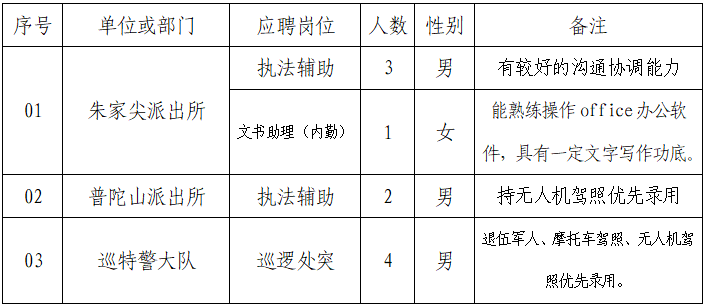 因工作需要,舟山市公安局普陀山分局決定面向社會(huì)公開招聘執(zhí)法執(zhí)勤輔助人員,現(xiàn)將有關(guān)事項(xiàng)公告如下: